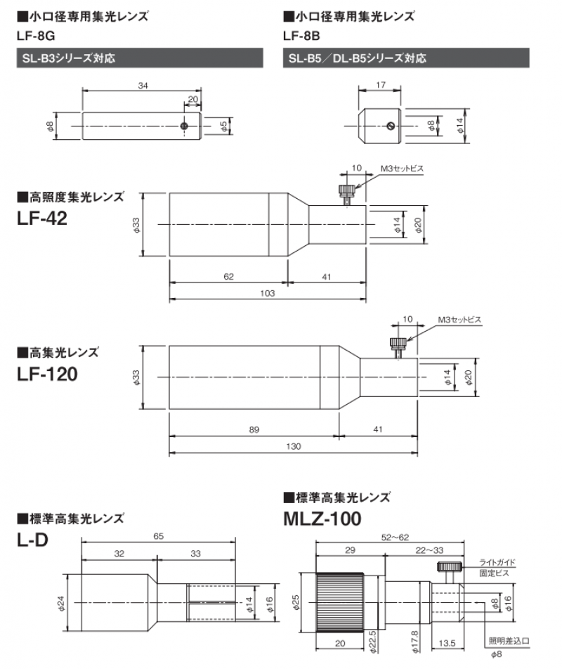 | 品名 | 小口径専用集光レンズ | 小口径専用集光レンズ | 高照度集光レンズ | 高集光レンズ | 標準高集光レンズ | 標準高集光レンズ | バックライト用直角投光タイプ | バックライト用直角ミラーボックス | バックライトユニット |